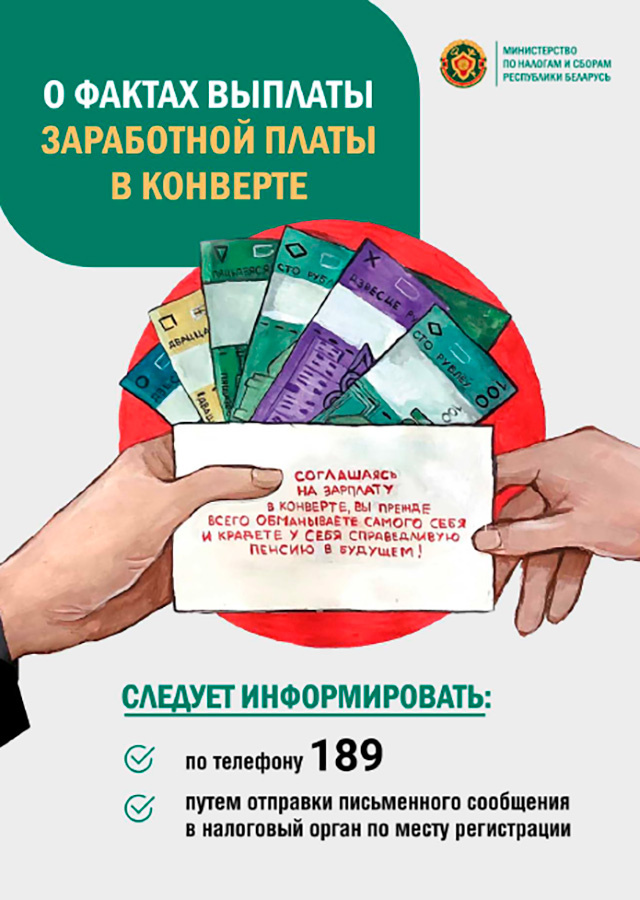 Информация о фактах выплаты заработной платы "в конверте" регулярно передается в территориальные подразделения государственного внебюджетного фонда социальной защиты населения. Фонд социальной защиты населения и Белорусское республиканское унитарное страховое предприятие "Белгосстрах" для взыскания причитающихся отчислений.