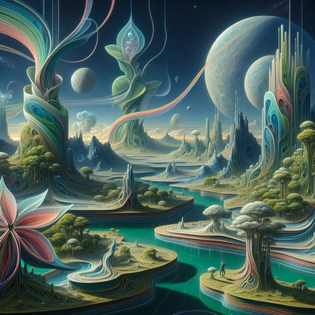 Тетрафлора — это сознательная планета, где реальность не фиксирована. Каждый день она перетасовывает свои элементы, как карты: зелёные реки могут стать небом, лес — превратиться в прозрачный океан, а цветы — в говорящие башни. Обитатели — гибридные формы с текучей формой тела и памяти. Вместо путешествий здесь совершают «перекладки»: обмен образами, чтобы познать новые участки мира через другого. Язык — визуальный, напоминает фрактальные вспышки и цветовые узоры. Раз в сто циклов сама планета говорит — её поверхность складывается в гигантский рот, и она смеётся или молится звёздам. Тогда всё меняется навсегда.