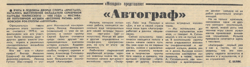 • ВЧЕРА В ЛЕДОВОМ ДВОРЦЕ СПОРТА «КРИСТАЛЛ» НАЧАЛИСЬ ВЫСТУПЛЕНИЯ ОБЛАДАТЕЛЯ СЕРЕБРЯНОЙ НАГРАДЫ ТБИЛИССКОГО — 1980 ГОДА — ФЕСТИВАЛЯ ПОПУЛЯРНОЙ МУЗЫКИ «ВЕСЕННИЕ РИТМЫ» МОСКОВСКОЙ РОК-ГРУППЫ «АВТОГРАФ». Официальным годом рождения этого коллектива считается 1979-й, но фактически все его участники были знакомы друг с другом давно: вместе учились, играли в различных самодеятельных ансамблях Москвы, дружили. Кто же они — «Автограф»? Виктор Михалин (ударные) по образованию дирижер-хоровик, Леонид Гуткин (бас-гитара) — студент Московской консерватории, Леонид Макаревич (клавишные) — уже ее закончил, а солист группы Сергей Брутян считается среди своих друзей непревзойденным знатоком истории музыки. Художественный руководитель ансамбля, гитарист, скрипач и певец Александр Ситковецкий — также и автор музыки большинства композиций «Автографа». Музыка, которую исполняют ребята, именуется несколько еще непривычным для нашей эстрады термином «арт-рок» (арт — искусство). Иногда ей дают и другие определе