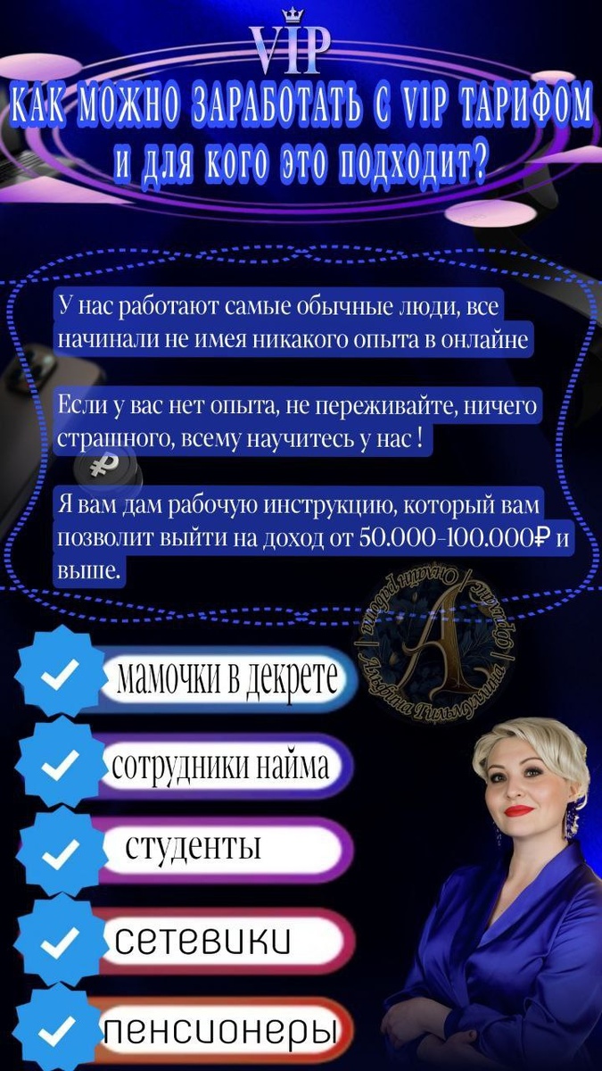 🔵 ЧТО КАСАЕТСЯ РАБОТЫ, ОДНОЗНАЧНО КАЖДЫЙ НАЙДЕТ СВОЁ НАПРАВЛЕНИЕ: 🔵 Я выделю основные варианты заработка в проекте: (доход рассчитан примерный). 🔵 1. Куратор Лицензированной онлайн школы - доход от 3.000-18.000 рублей в день и выше🔥🔥🔥 🔹 Работа на входящих заявках и на предоставлении доступа в наш проект 🔹Суть работы в продвижении проекта в соц.сетях и обработка входящих заявок 🔹 Пошаговое обучение по ведению соцсетей 🔹 Предоставление доступа к проекту 🔹 Ведение своих новичков 🔹 Ежедневный доход на карту✅ 🔹 Доход в первый месяц составит от 50.000-100.000₽ 🔵 2. Менеджер/предприниматель Маркетплейсов 🔹Суть работы: ведение кабинета предпринимателя/селлера в маркетплейсах 🔹 Анализ рынка конкурентов 🔹 Оформление и ведение магазина на платформе 🔹 Управление ассортиментом 🔹 Взаимодействие с производителями и поставщиками 🔹 Управление логистикой и доставкой 🔹 Продвижение товаров 🔹 Аналитика и отчётность Доход новичка в первый месяц 15-30тыс. рубле