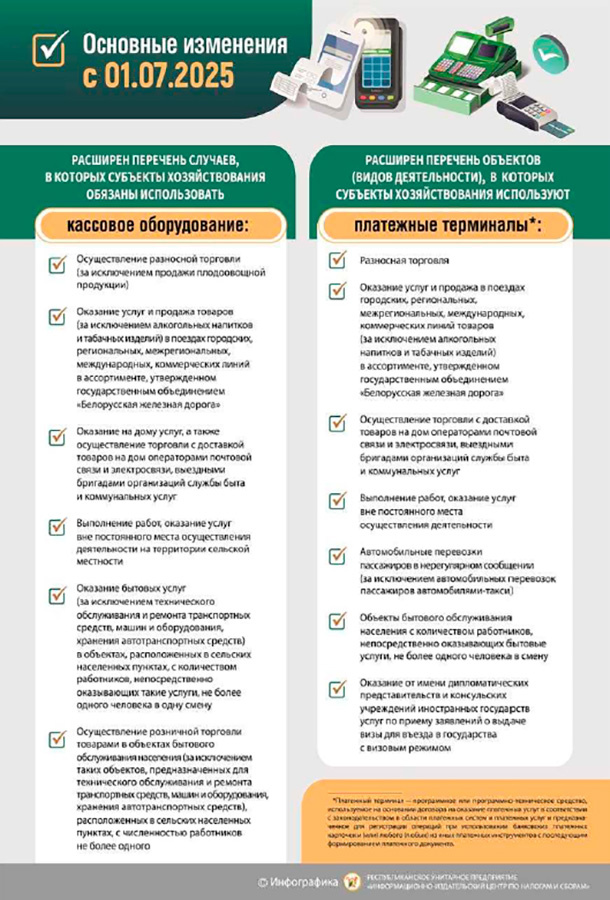 С 01.07.2025 расширяется перечень объектов (видов деятельности), в которых (при осуществлении которых) юридические лица и индивидуальные предприниматели обязаны использовать платежные терминалы (подпункт 2.10 пункта 2 постановления Совета Министров Республики Беларусь и Национального банка Республики Беларусь от 06.07.2011 № 924/16 "Об использовании кассового оборудования при приеме средств платежа").