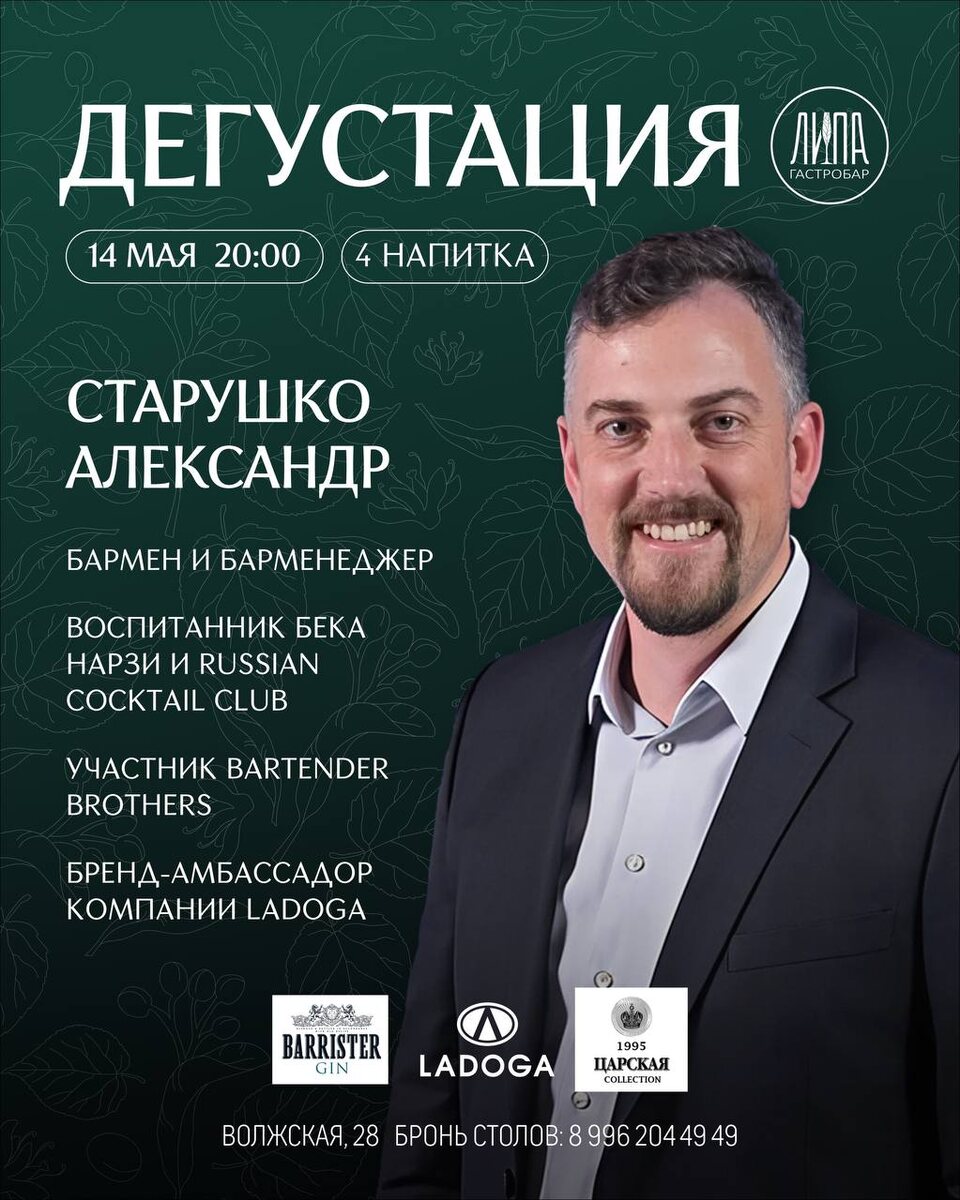 Дегустация от компании Ladoga! 14 мая в 20:00 мы представим 4 авторских напитка на основе продукции Ladoga, включая Barrister Gin и Царскую коллекцию. Ведущий вечера — Александр Старушко: бармен и бар-менеджер, участник Bartender Brothers, выпускник Russian Cocktail Club и бренд-амбассадор Ladoga. Будет интересно и вкусно — обязательно приходи! Сотрудникам сферы общепита — скидка 50% на всё меню. 📍 Волжская, 28 Бронь столов: +79962044949
