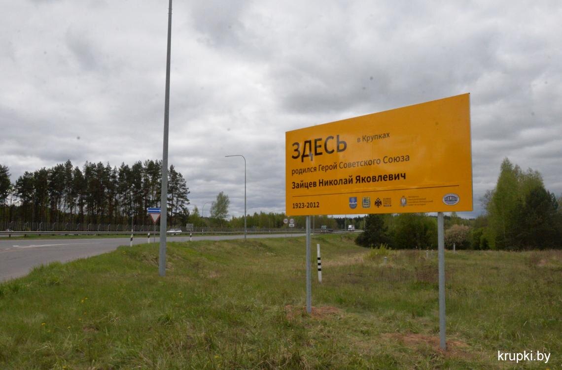 Билборды установлены на трассе М-1 при въезде в Крупский район с двух сторон. Они посвящены героям Советского Союза, уроженцам Крупского района Николаю Яковлевичу Зайцеву и Михаилу Денисовичу Шестакову.