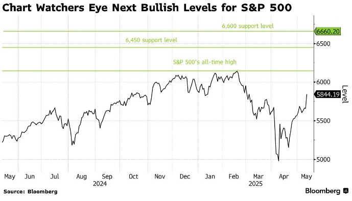 Индекс S&P 500 закрылся выше отметки 5750, своей 200-дневной скользящей средней, впервые с конца марта, и наблюдатели за графиками ожидают новых исторических максимумов. Ослабление напряжённости в торговых отношениях между США и Китаем, которое привело к резкому росту акций в понедельник, побудило аналитиков ожидать новых исторических максимумов индекса S&P 500. Индикатор завершил торги выше отметки 5750 — своей 200-дневной скользящей средней — впервые с конца марта. По мнению Джона Коловоса, главного технического стратега Macro Risk Advisors, теперь нет серьёзных уровней сопротивления до 6144, рекордного максимума, достигнутого S&P 500 19 февраля. Уровни сопротивления — это точки, где ожидается замедление бычьего тренда, поскольку продажи могут превысить покупки. Прорыв выше этих уровней указывает на изменение настроений. «Торговля S&P 500 выше 200-дневной скользящей средней — ещё один признак того, что тренд становится положительным», — отметил Коловос. «Это увеличивает вероятность т