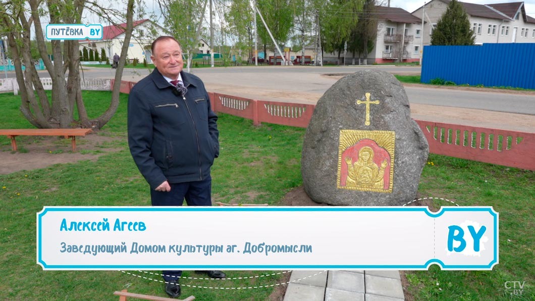 Чтобы сделать эту икону на камне, я спрашивал разрешение у Витебской епархии. Где стоит ива и еще дальше стоял доходный дом деда Марка Шагала. Сюда приезжал Марк Шагал на каникулы, эту икону я решил посвятить ему и жителям нашего агрогородка, который называется Добромысли – добрые мысли. Люди добрые здесь живут. Эта икона Богоматери называется «Оранта», она охраняет нашу землю. Если вы хотите исполнить свое желание, можете прикоснуться к этой иконе. Она всегда теплая, даже зимой теплая икона. Снег никогда на ней не задерживается.