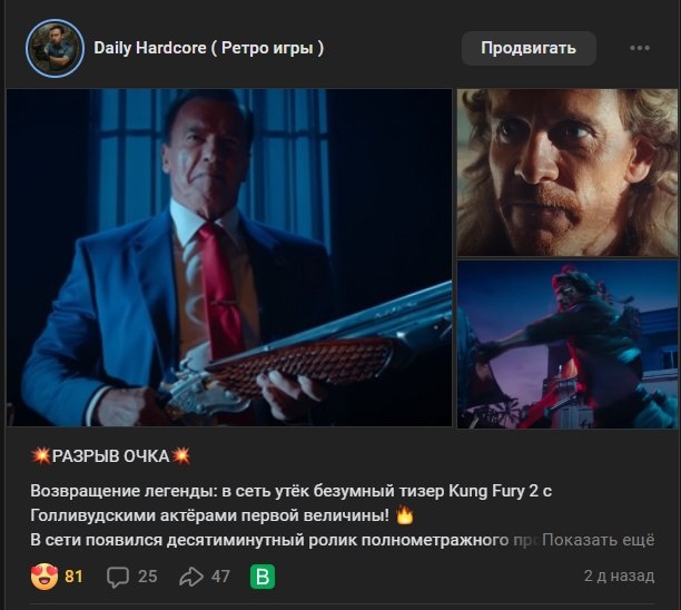 Заднеприводное вк заблокировало мне видео по Kung Fury 2 это просто трейлер, официального представительства студии в вк нет, они могут просто своим "Амбассадорам" давать размещать видосы за бабки, чтобы те собирали все сливки с постов. Другие же новостные группы как я сосут бибу. Спрашивается, а зачем вообще нужен вк если тут нельзя ничего размещать и просмотры тут если что-то собирает вк за это не платит? :) Какой смысл, люди которые в вк сидят 24 на 7 они будут куда-то переходить? Нет, часто люди у меня переходят именно с других платформ в вк, потому что никто не хочет свои увлечения для друзей и родственников светить, а настройку в приватности, чтобы никто не видел что они смотрят люди отключают редко. Вк просто среляет себе каждый раз в колено и потом пытается войти в конкурс с другими соц-сетями, но похоже пока ВК не запретит всех и вся через властные структуры, они не смогу с такими правилами конкурировать с кем-то. А да и в "Фонд авторов вк и моентизацию" они берут только избран