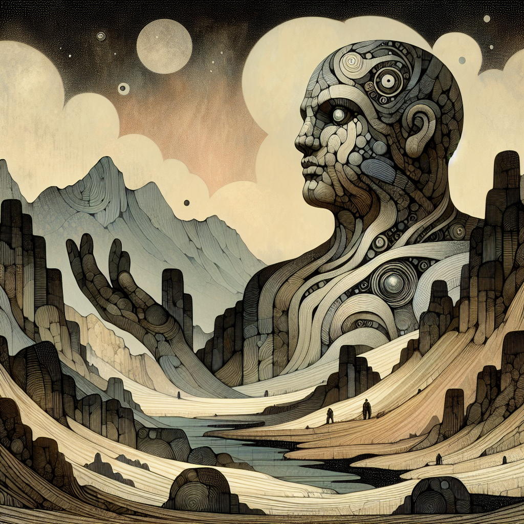 В этом мире резьба по камню — не искусство, а способ выращивать жизнь. Гигантские статуи вырастают из пологих склонов: их скулы — скалы, глаза — озёра, пальцы расщепляются в леса. Они медленно двигаются, но ни один не видел, как. Говорят, что каждое поколение людей живёт на другой части тела. В каком-то веке статуя, возможно, моргнёт. Структура мира подстраивается под форму этих биостатуй, которые соединены друг с другом подземными нервами из чёрного обсидиана. Здесь воспоминания хранятся как текстуры каменной плоти — их можно читать ладонями.