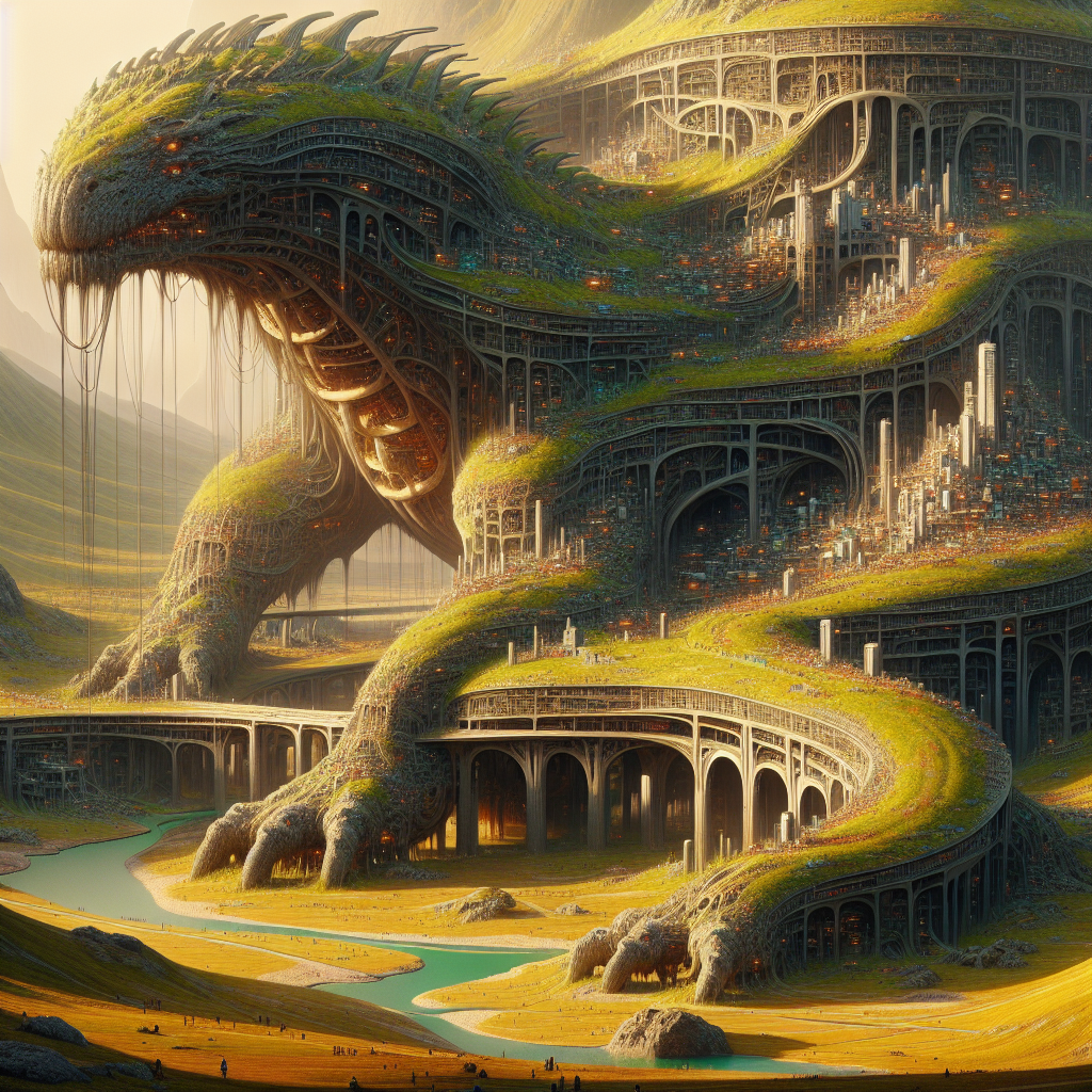 Посреди бесконечной равнины движется нечто гигантское — Великое Существо Дра. На его спине, покрытой броней из травы и камня, вырос целый город. Дома цепляются за его выступы, растут вдоль хребта, а дороги проходят между чешуёй. Во время дыхания Великого Тела улицы слегка поднимаются и опадают. Горожане живут в ритме его движения, едут туда, куда направляется Дра — он не разговаривает, но сновидцы уверены, что слышат его мысли во сне. Внутри его тела — огромные залы, наполненные ветром и светом, где проходят праздники, посвящённые дыханию самой Земли.