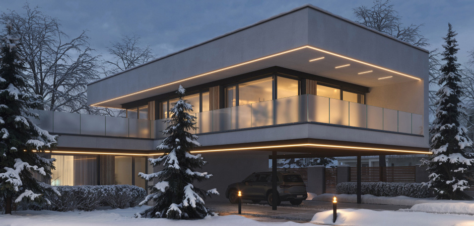 Свет подчеркивает архитектуру и помогает ориентироваться, выделяя входы или акцентные детали. Для подсветки фасадов можно использовать светильники и специальные ленты.