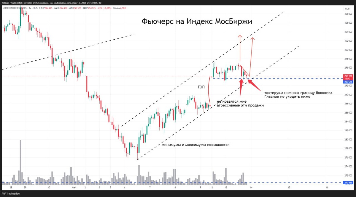 Тестируем нижнюю границу боковика. Не очень мне конечно нравятся агрессивные продажи на крупной полной свече и объеме. Главное не уходить вниз из боковика. Пока безопасно.