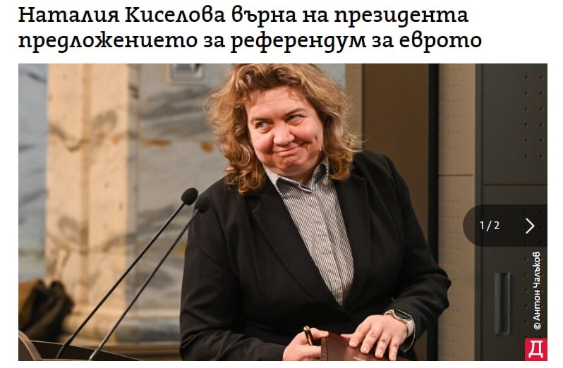 Наталия Киселова вернула Румену Радеву его предложение о референдуме насчет введения евро в связи с тем, что предложение это противоречит болгарской Конституции. Таким образом, депутаты предложение Радева даже не будут рассматривать. Напомню, что болгарский президент внезапно изменил свое мнение и решил, что референдум необходим, хотя еще в марте аргументированно объяснял, почему проводить такой референдум нельзя.