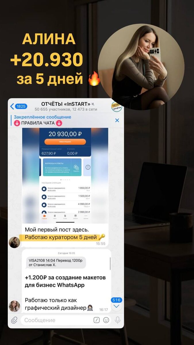 На самом деле, у всех по-разному. Все зависит от того, сколько времени ты будешь уделять работе. На начальных этапах можно зарабатывать от 30-50к, а дальше твой доход будет только расти Например, Алина в проекте за 5 дней заработала 👉 20.930₽ ! Чудесный результат, правда? Возможно это не такая большая сумма, но она заработана в телефоне, в свободном графике, без начальника и будильника☺️ Давай попробуем работать так же? Начнем в любое время, оплатить сможешь уже с заработанных денег❤️ Выбирай, как тебе удобнее 👇