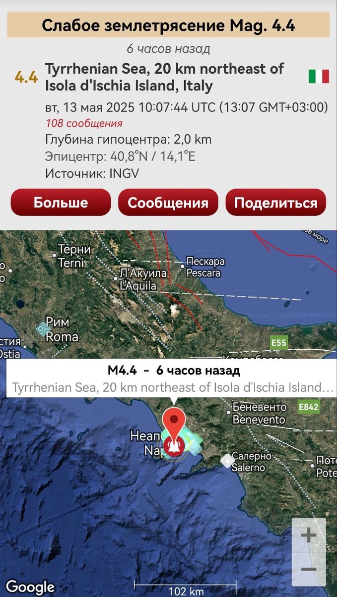 В ответ на пост Согласно предупреждению от 5 мая Италия отработала слабым ощутимым землетрясением в районе Флегрейских полей, которые у нас совместительству - супервулкан. ==== Italy has experienced a weak, noticeable earthquake in the area of the Phlegrean fields, which we also know as a supervolcano.