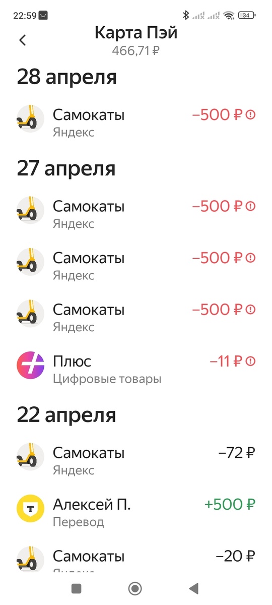 Сижу в липиздричке, телефон листаю, вдруг пуш выскакивает от Яндекс Го. Нет, "ГО" это игра такая. Или Гоу. Но, лучше всё таки " GO". - " У вас штраф 500 рублей"! Странно, я к Яндексу уведомления о штрафах не привязывал. Вышел из электрички, хотел арендовать самокат, а мне отказ! - "У вас задолженность за поездку 500₽! " Интересно, где это я так долго катался? Захожу в Яндекс ПЕЙ, который привязан к ГОУ (тьфу блин, птичий язык!) и вижу такую картинку. Самокаты у меня пытаются спиз... пардон, списать деньги! Хорошо, я для этих целей и имею виртуальную карту. Придется пообщаться с поддержкой. О как! Припоминаю, что в этот день были проблемы с завершением аренды, самокаты не видели, где они находятся, но я был упорный. Кто пользовался самокатами, знает, что завершить поездку вне зоны парковки не получится. Нашел в истории поездок этот день. Поездки завершены, деньги списаны. Хотя утром я ехал возле озера (нижний скрин) по какой то немыслимой синусоиде. Ладно бы вечером, можно списать на "в