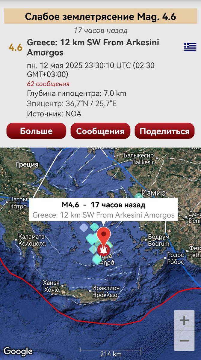 По облачным индикаторам от 5-6 мая произошло слабое ощутимое землетрясение в Эгейском море. Возможна более сильная сейсмика по данной зоне. Энергия сброшена не вся. ==== According to the cloud indicators from May 5-6, a weak noticeable earthquake occurred in the Aegean Sea. Stronger seismic activity is possible in this area. Not all of the energy has been discharged.