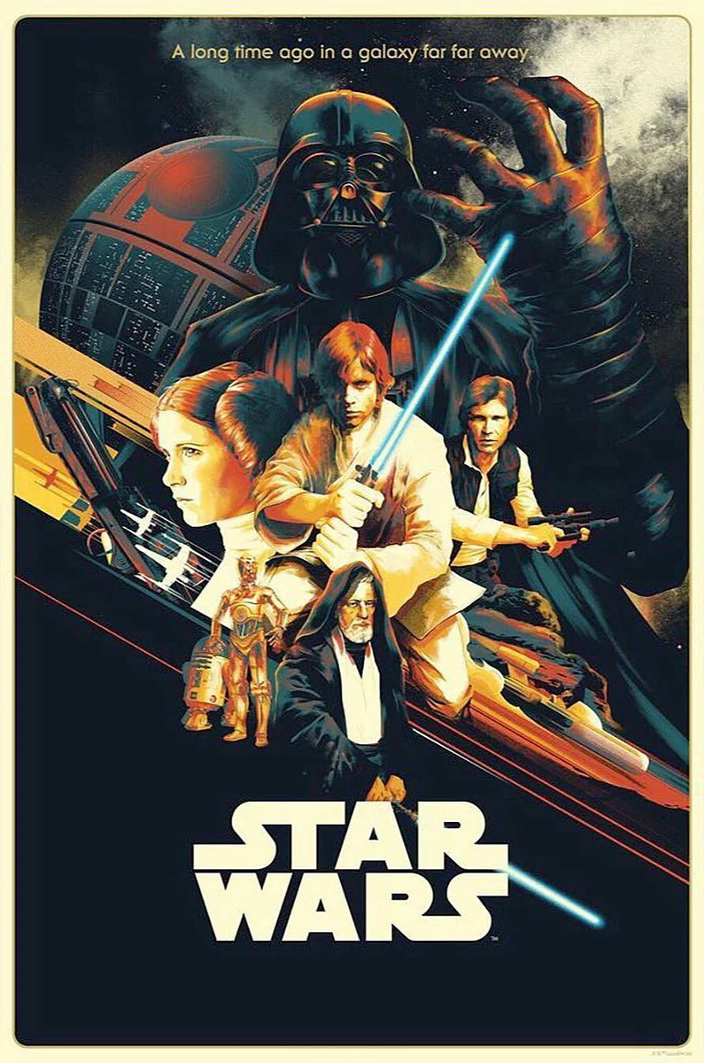Взгляните на постер «Челюстей» (1975): девушка, плывущая наверху, и гигантская акула, поднимающаяся снизу. Минимум деталей — максимум напряжения. Всё ясно и без слов. Или «Звёздные войны» (1977): героическая поза Люка, Лея в стиле комиксов, космос — почти как обложка старого романа в духе "Флэш Гордона".