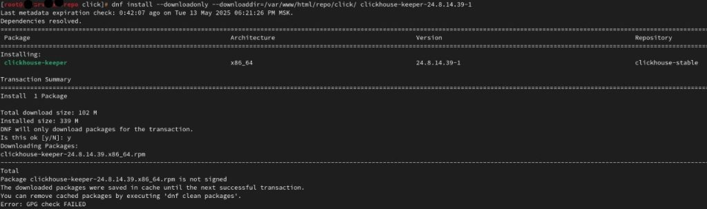 - Поместим пакет clickhouse-server-24.8.14.39.x86_64.rpm в директорию репозитория: