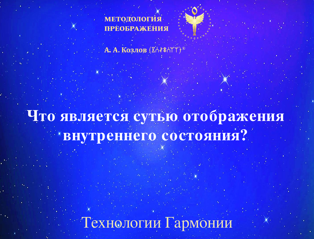 Что является сутью отображения внутреннего состояния? Когда система «душа-психика» приходит в состояние спокойствия? Как получить высокие позитивные энергии? На вопросы отвечает Александр Анатольевич Козлов – автор Методологии Преображения. «Через взаимодействия человек учится познавать и понимать, что его реакция на внешние процессы есть суть отображения его внутреннего состояния. Пробужденный дух, работающий в поле сознания, чутко улавливает импульсы, идущие от души, и волевым движением гасит волну возбуждения, не даёт проявиться низким психическим энергиям. Система «душа - психика» приходит в состояние равновесия и спокойствия. Меняется точка зрения и формируется более высокое видение внешней ситуации, происходит гармоничное взаимодействие без нарушения границы с другими живыми системами. Только такое взаимодействие можно назвать духовным [14]. Взаимодействие человека с человеком на духовном уровне проходит на основе духовных знаний и новых идей. Такое общение способствует получению