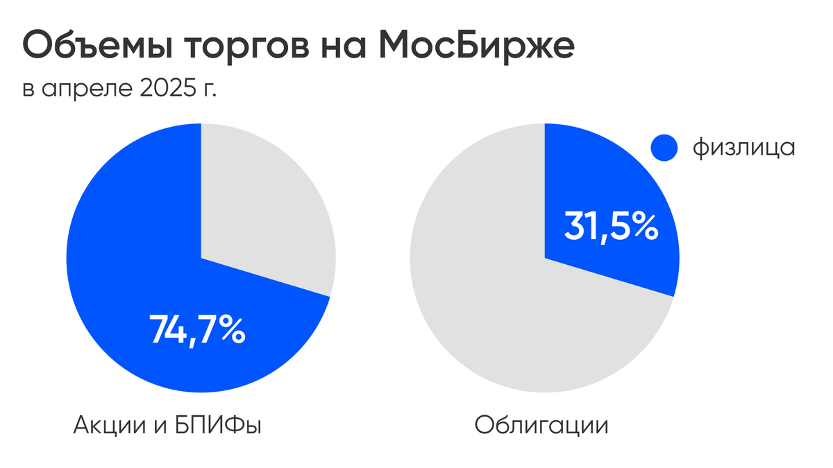 за апрель. Частных инвесторов стало почти на 400 тыс. больше, их количество достигло 36,7 млн и у них 67,9 млн. счетов. По итогам месяца они инвестировали: При этом доля физлиц в объеме торгов акциями и ПИФами составляет 74,7%, облигациями – 31,5%. // Несмотря на то, что на бирже растет число частных инвесторов, активность в апреле проявляли только 3,6 млн. человек, то есть только каждый десятый. == $MOEX: ₽ 203,82 (-12,1% за год).