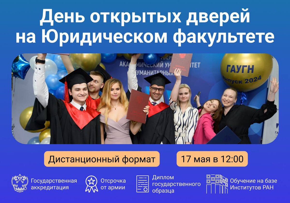 🎓 День открытых дверей Юридического факультета 🎓 17 мая состоится День открытых дверей программ магистратуры Юридического факультета ГАУГН в дистанционном формате. 📖 Магистратура Факультета — это больше, чем просто продолжение образования. Это шанс углубить свои знания в области права и приобрести практические навыки под руководством ведущих специалистов отрасли и стать частью профессионального сообщества. 📆 Дата и время: 17 мая в 12:00. 📍 Формат проведения: дистанционный. *Ссылка на видеоконференцию будет направлена зарегистрированным участникам на электронную почту до начала мероприятия. 🖇️ Зарегистрироваться на День открытых дверей можно по ссылке (в перечне дат необходимо выбрать 17 мая). Ждём вас в ГАУГН! #юристыГАУГН #День_открытых_дверей #абитуриенты25 #простРАНство_ГАУГН #gaugn_priem