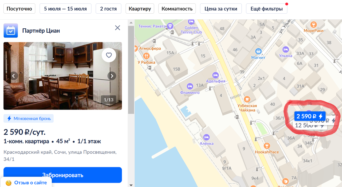 Друзья, сегодня ради интереса посмотрели на одном из популярных сайтов о недвижимости цены на посуточную аренду жилья у нас в Адлере и обнаружили, что и на рынке аренды тоже встречаются объявления "фонари", то есть лишь бы заманить клиента. Об объявлениях-"фонарях" на рынке продажи сочинской недвижимости мы писали в своих статьях уже давно. Стоит ли верить объявлениям о продаже недвижимости в Сочи. Не повторяйте наших ошибок. Вот например, смотрим квартиру на карте, её якобы можно снять в июле в Адлере не далеко от моря за 2590 руб. в сутки, очень хорошая цена, но когда переходишь на страницу онлайн бронирования цена этой квартиры на 10 суток аренды оказывается 127 тысяч рублей, то есть в сутки 12 700 руб., или квартира за 3500 руб. в сутки оказывается стоит 99 000 за 10 суток! Вот такие чудесные превращения от адлерских риэлторов! Но похоже, что городской округ Сочи и федеральная территория Сириус в этом курортном сезоне будет главным местом пляжного отдыха в России. Другие традицион