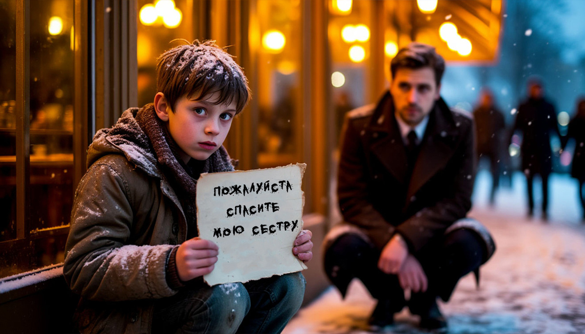 Вечер был холодным и безмолвным, словно сама зима затаила дыхание. Мелкий, почти невесомый снег кружился в воздухе, опускаясь на плечи прохожих, спешивших по своим делам с опущенными головами. В самом сердце шумного города, у входа в роскошный ресторан, где светились золотом витрины и смешивались ароматы изысканных блюд, сидел мальчик. Ему было лет девять. Его пальто, давно потерявшее цвет, висело мешком, а ботинки, явно великоватые, казались ещё одним грустным напоминанием о его одиночестве. Но больше всего поражали глаза — глубокие, тёмные, словно лишённые детства. В руках он сжимал кусок картона с криво выведенными буквами: «Пожалуйста, спасите мою сестру». Люди проходили мимо, торопливо отводя взгляд. Кто-то бросал мелочь, не останавливаясь, кто-то лишь вздыхал, качая головой. Никто не спрашивал, что случилось с его сестрой. Никто не замедлял шаг. Но был один человек. Иван Никифоров — миллиардер, основатель крупнейшей IT-империи страны — вышел из ресторана, поправляя воротник доро