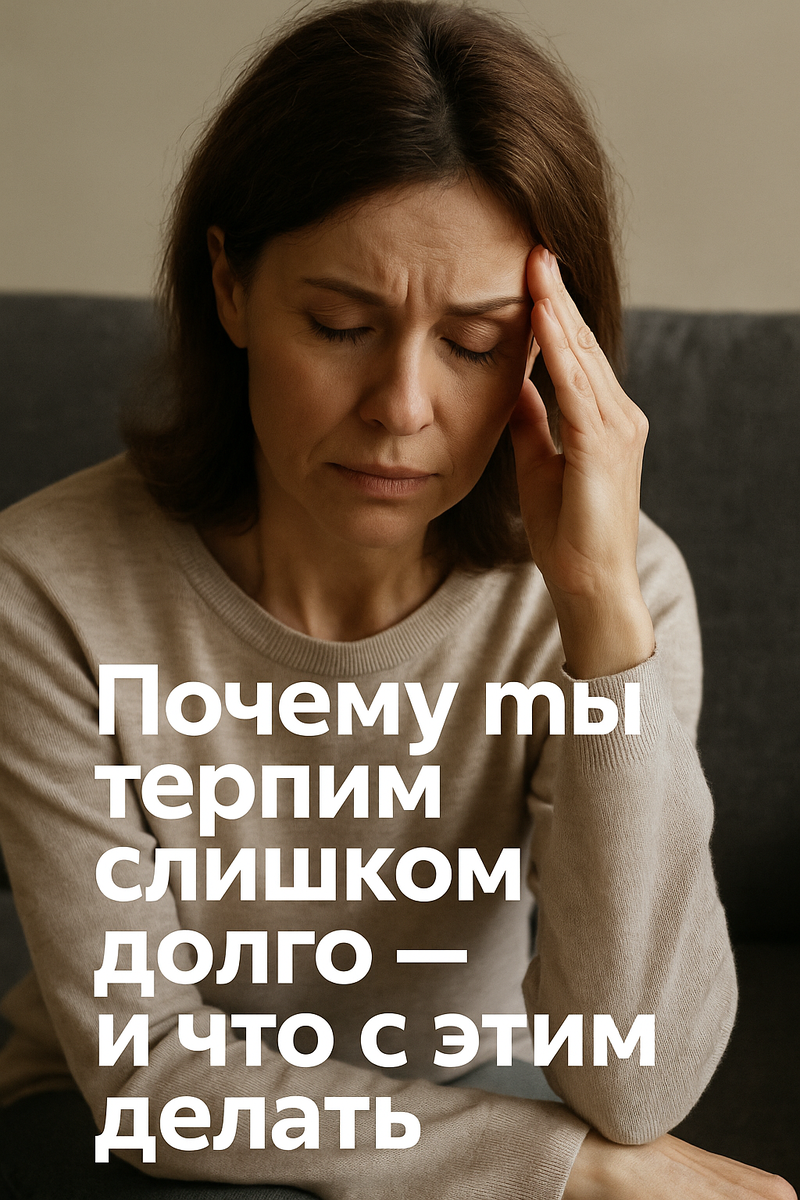 Мы умеем терпеть. Мы вообще чемпионы по выживанию на внутренних резервах. Терпим, когда не нравится. Когда больно. Когда обидно. Когда уже нет сил, но «ну ещё чуть-чуть». Терпим в отношениях, в работе, в семье, в одиночестве. Иногда годами. А потом удивляемся, откуда эта хроническая усталость, обида на весь мир и пустота внутри. Я не говорю про терпение как силу. Я говорю про то, что маскируется под «просто держусь» — но на самом деле разрушает. Про это молчание, в котором хочется кричать. Про улыбки, когда внутри всё сжимается. Про «да ничего, всё нормально», когда хочется уйти и не возвращаться. Почему мы так долго терпим? Потому что боимся потерять. Потому что не хотим никого разочаровать. Потому что думаем, что вдруг станет лучше. Потому что нас так учили — быть удобными, послушными, сдержанными. Потому что не знаем, как по-другому. Потому что кажется, что если потерпеть ещё чуть-чуть — что-то изменится. Кто-то поймёт. Кто-то заметит. Кто-то спасёт. Но, как показывает жизнь, никто