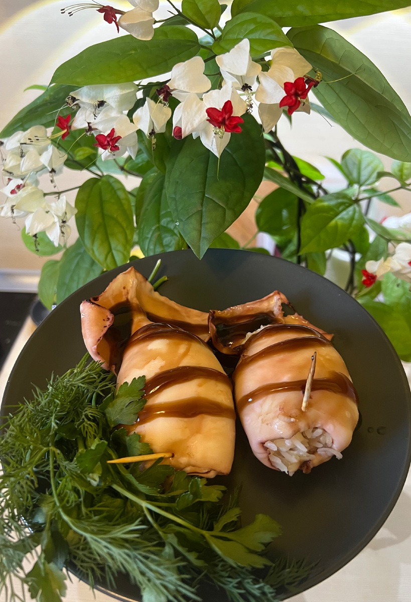 Для золотистого цвета можно предварительно обжарить кальмары (уже фаршированные) на сухой сковороде и только потом убрать в духовку запекаться (время запекания остается такое же), как я готовила другую вариацию фаршированных кальмаров.