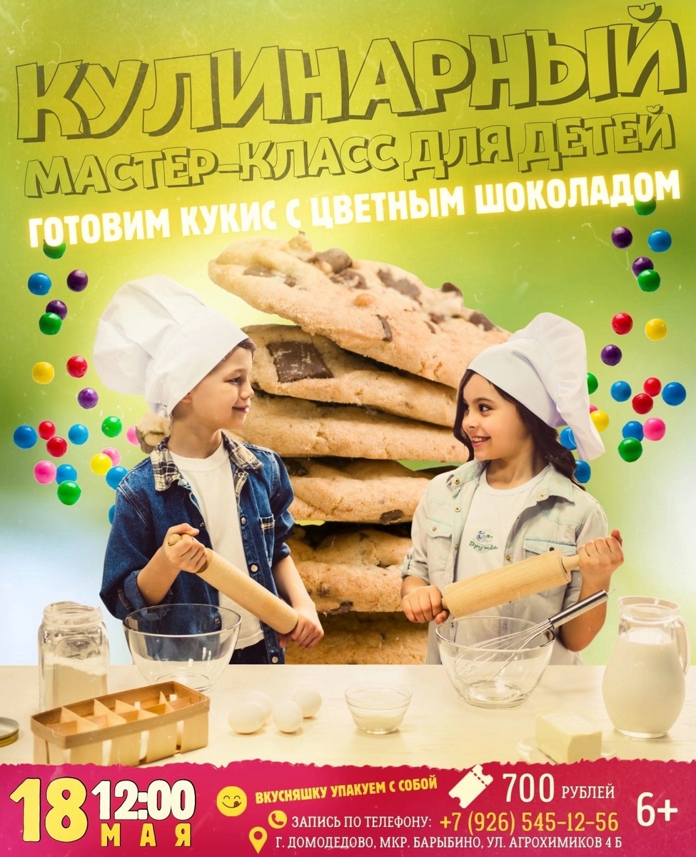 ✨ 😋КУЛИНАРНЫЙ МАСТЕР-КЛАСС 🧑🍳 Вместе с профессиональным кондитером Викторией Горьковой ребята приготовят наивкуснейшие ароматные печенья - кукисы с цветным шоколадом! 😋 ________________________________________ Скорее записывайтесь 🤗 +7 (926) 545-12-56 Виктория 🚫 Возраст: 6+ 📆 18.05.2025🕒12:00 🏢 Городской дом культуры «Дружба» 📍 г.о. Домодедово, мкрн.Барыбино, улица Агрохимиков, д.4Б 💰 Цена: 700 ₽ ✅ Мероприятия Домодедово https://dzen.ru/id/66f10385cc4c5a16f7b5fb02 http://vk.com/domodedovo_events http://dzen.ru/domodedovo_events