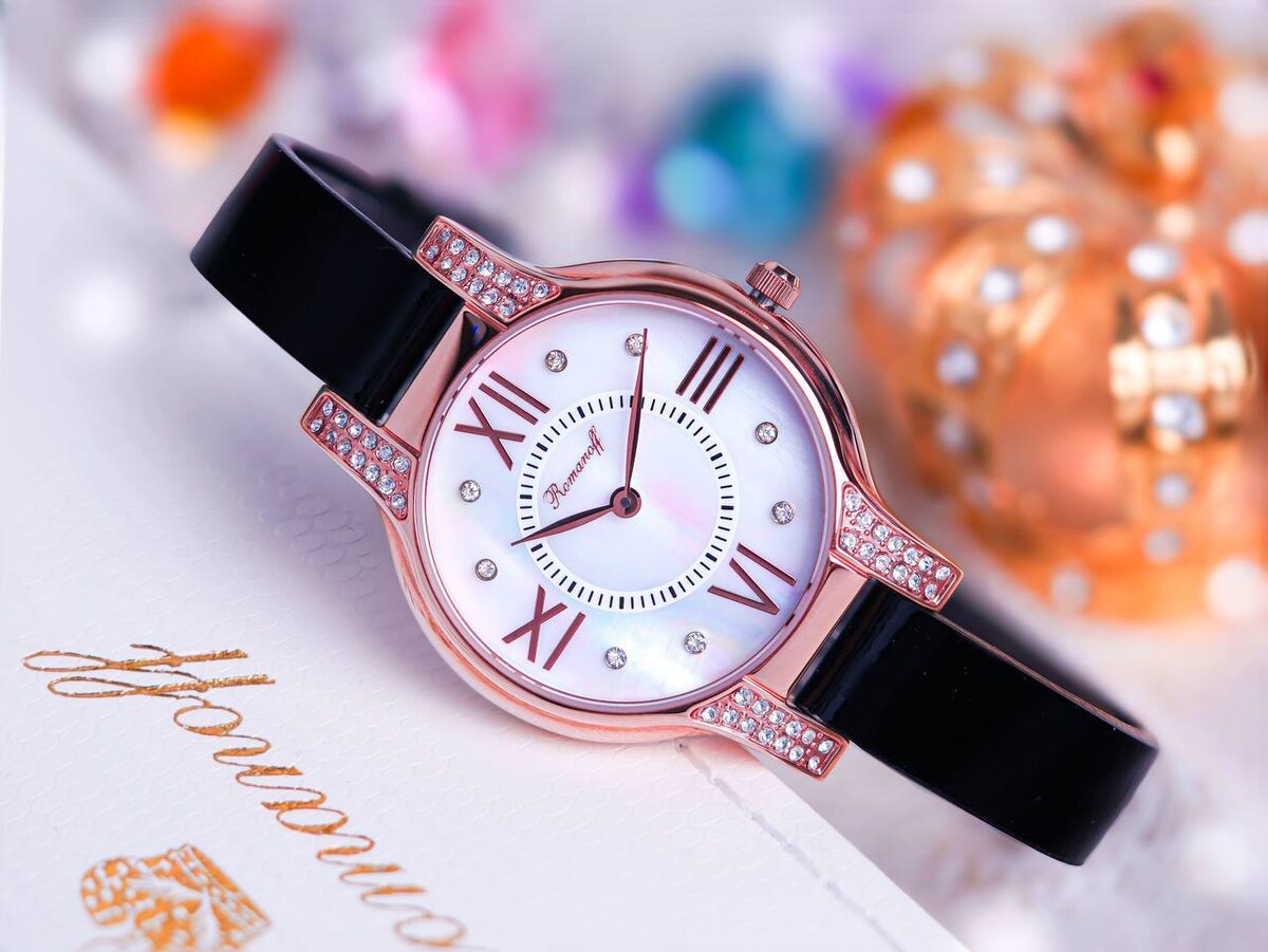 Удлиненные ушки украшены россыпью фианитов, а белый перламутровый циферблат отлично сочетается с черным лаковым ремешком. Ювелирные часы Romanoff идеально дополнят офисный костюм или повседневный образ. 👗💫 ₽ 11.990