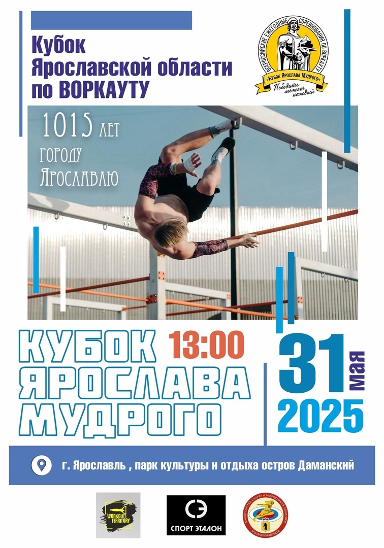 31 мая 2025 года в рамках празднования 1015 летия города Ярославля состоится Кубок Ярославской области по Воркауту. Кубок "Ярослава Мудрого" Дисциплины : Воркаут баттлы 1*1