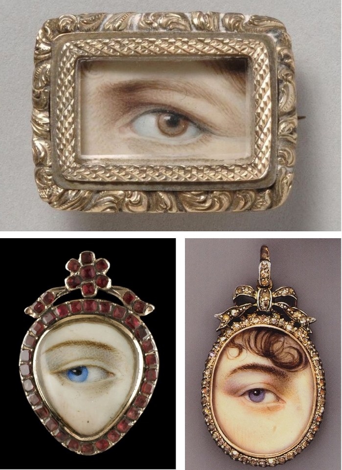 С этими украшениями связана романтическая легенда: будущий король Англии George IV якобы получил в подарок от возлюбленной миниатюру с изображением только ее глаз, чтобы посторонние не могли узнать персонажа и влюбленные могли бы сохранить в тайне.
