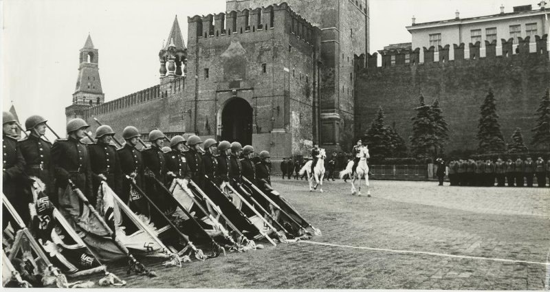 24 июня 1945 года в Москве состоялся легендарный парад в честь Победы над гитлеровской Германией. Кто из иностранных военных участвовал в параде? Почему всего за 10 минут до вылета отменили пролет над Красной площадью 570 боевых самолетов? Кто принял решение бросить к подножию ленинского мавзолея 200 немецких знамен и по какому принципу их отбирали? Ответы на эти вопросы, а также уникальные кадры исторического парада Победы — в документальном фильме Алексея Денисова «Парад победителей». 13 мая в 19:50 по московскому времени. Смотрите «Историю»! P.S. На фото Евгений Халдея показан выезд маршала Жукова на парад и опущенные нацистские штандарты.