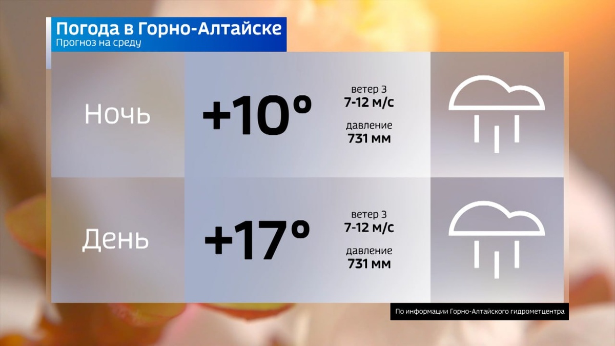☀️☀️☀️ Горно-Алтайск: 🌧Облачно, сегодня ночью и завтра днем дождь, днем гроза🌩, ветер порывистый, Температура воздуха 🌡 ночью плюс 9…11 °С, днем плюс 16…18 °С. По республике: 🌧Облачно, сегодня ночью и завтра днем дожди, местами сильные и очень сильные дожди, грозы🌩, град, ветер порывистый до 17-22 м/с, Температура воздуха 🌡 ночью плюс 6…11 °С, в горах минус 1…плюс 4 °С, днем плюс 18…23 °С, местами плюс 8…13 °С. #новости 👍 Подписывайся на Вести Эл Алтай