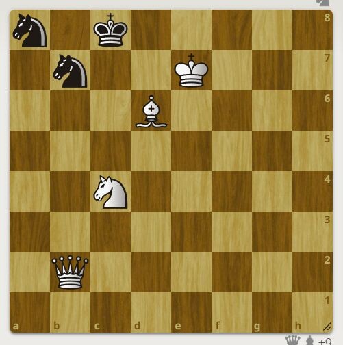 Автор задачи Лебедев Л.А., 1993 год. Два коня черных на защите короля. Однако белые начинают и ставят мат в 2 хода. Оригинальный рассказ о шахматах тут >>>> Первый верный ход смотрите в галерее.