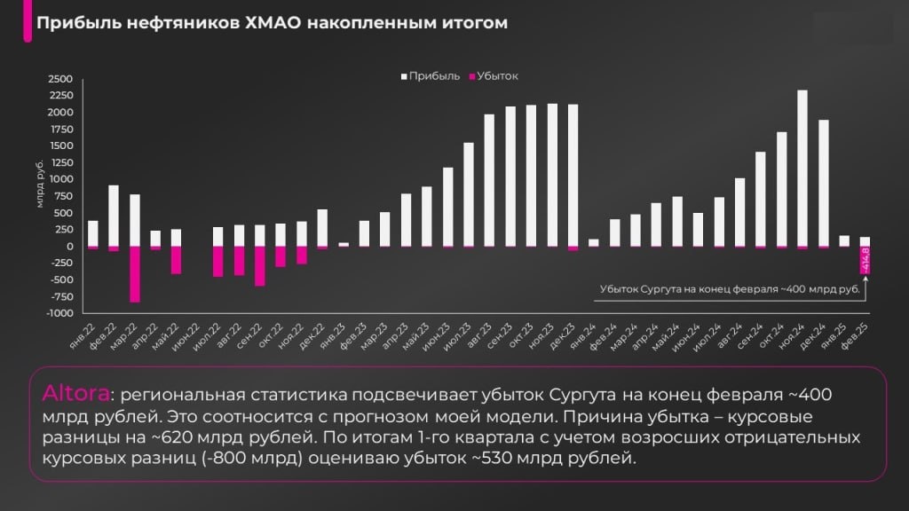Расчетный убыток Сургутнефтегаза в 1кв 2025 > 500 млрд руб. Убыток Сургутнефтегаза по итогам 1-го квартала Александр Антонов оценивает >500 млрд рублей. Но компания, судя по всему, успешно справляется с санкциями. Опубликованная региональная статистика по финансовому результату нефтяных компаний ХМАО сигнализирует об убытке Сургутнефтегаза по итогам 2-х месяцев 2025 г. в размере 400 млрд рублей. Эта цифра практически на 100% соотносится с прогнозом моей модели (поэтому я оставляю без изменений свои допущения относительно валютной составляющей финансовых вложений). Основная причина убытка – это отрицательные курсовые разницы (~620 млрд рублей). В марте они, по моей оценке, увеличились до ~800 млрд рублей. С учётом прибыли нефтяного бизнеса и полученных процентов ожидаю убыток по итогам 1-го квартала на уровне 530 млрд рублей. Вижу признаки того, что Сургутнефтегаз, вероятно, справляется с санкционными ограничениями без серьёзных потерь. Доступен показатель выручки нефтяников ХМАО по