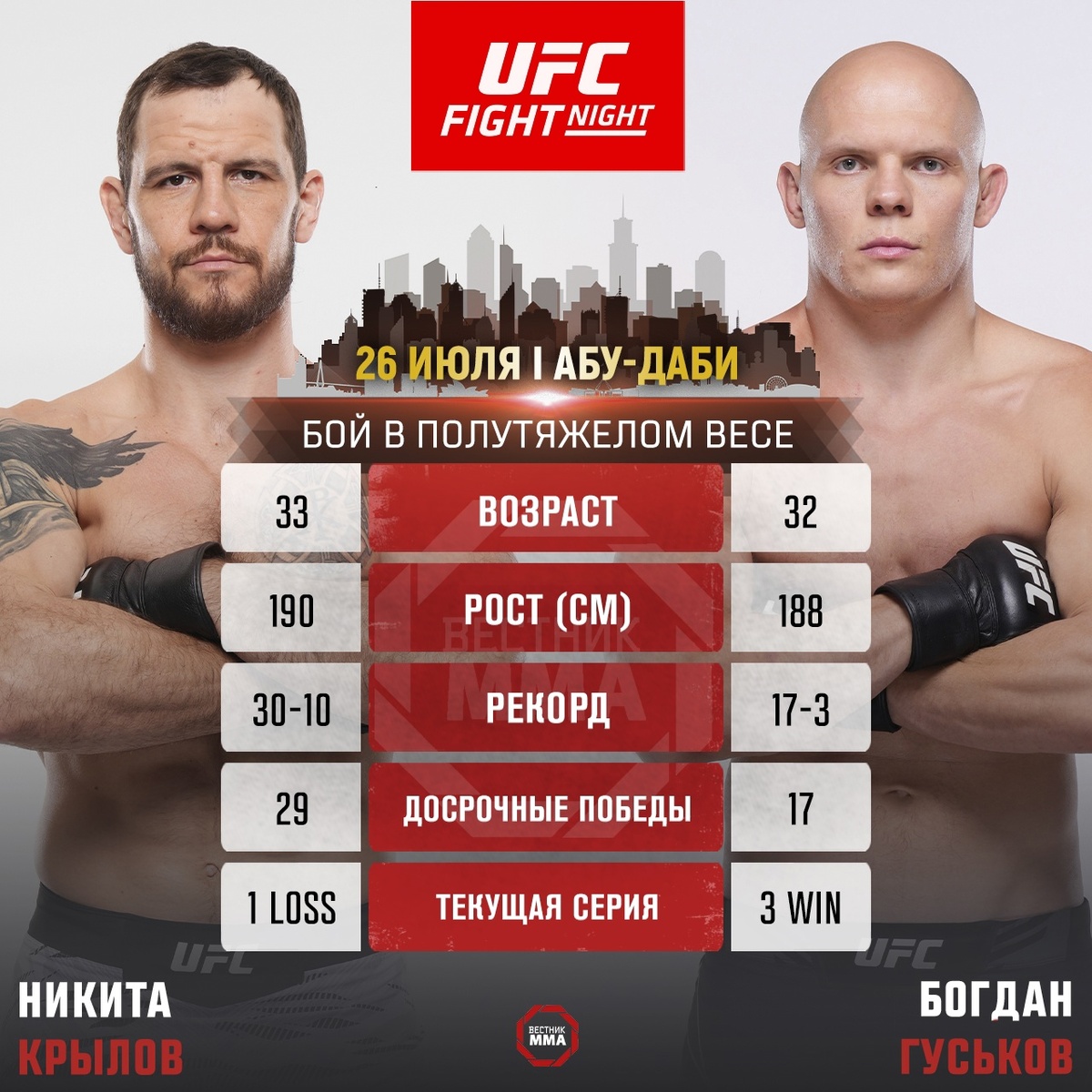 Столкновение двух ярких финишеров!!! 26 июля мы увидим бой Никиты Крылова (№10 в рейтинге | UFC UFC 10-8) и Богдана Гуськова (№14 в рейтинге | UFC 3-1) на UFC Абу-Даби.