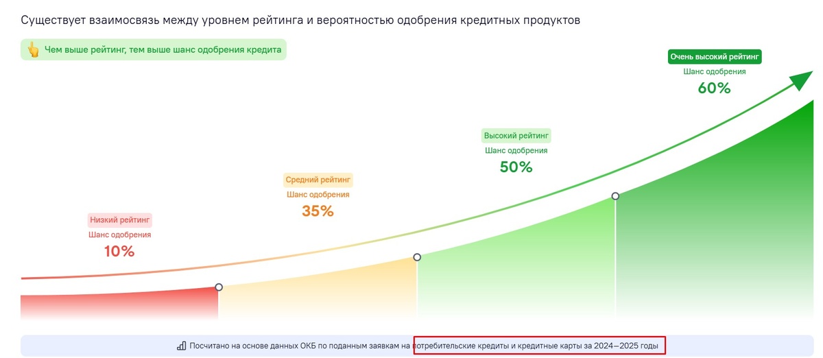 Поэтому в текущем 2025 году прямо критично важно отслеживать свой кредитный рейтинг. Потому что посмотрите, вот какая зависимость есть между ним и одобрением РАЗНЫХ банковских инструментов, не только кредитов, но и кредиток: