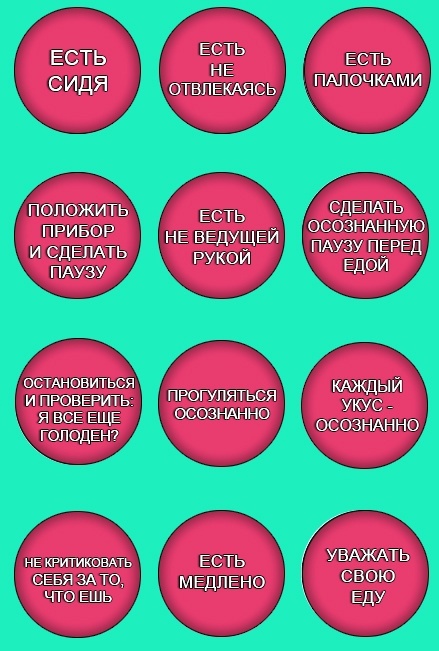 Твистер (карта осознанного питания) – как упражнение при РПП Многим из нас нравятся разного рода игры, в которые можно поиграть вместе с друзьями или просто одним . Это весело и интересно… К примеру, такой игрой можно назвать твистер. Это подвижная игра для шумной компании… На что-то подобное я наткнулся в одной из книг Светланы Бронниковой, только для людей с расстройством пищевого поведения. Это упражнение может существенно увеличить уровень осознанности вашего питания и вовремя услышать сигналы о насыщении и при этом визуально чем-то похоже на твистер. Я хочу им с вами поделиться. Правила «игры» очень простые: закройте глаза и случайным образом ткните пальцем на любой из пунктов путеводителя осознанного питания. Делать это можно при любом приёме пищи, перед ним или даже во время него. Все пункты в этом пищевом твистере довольно простые и уж точно полезные. Единственный кружок, о котором стоит рассказать по подробнее – это «уважай свою еду». Данный пункт является самостоятельным упра