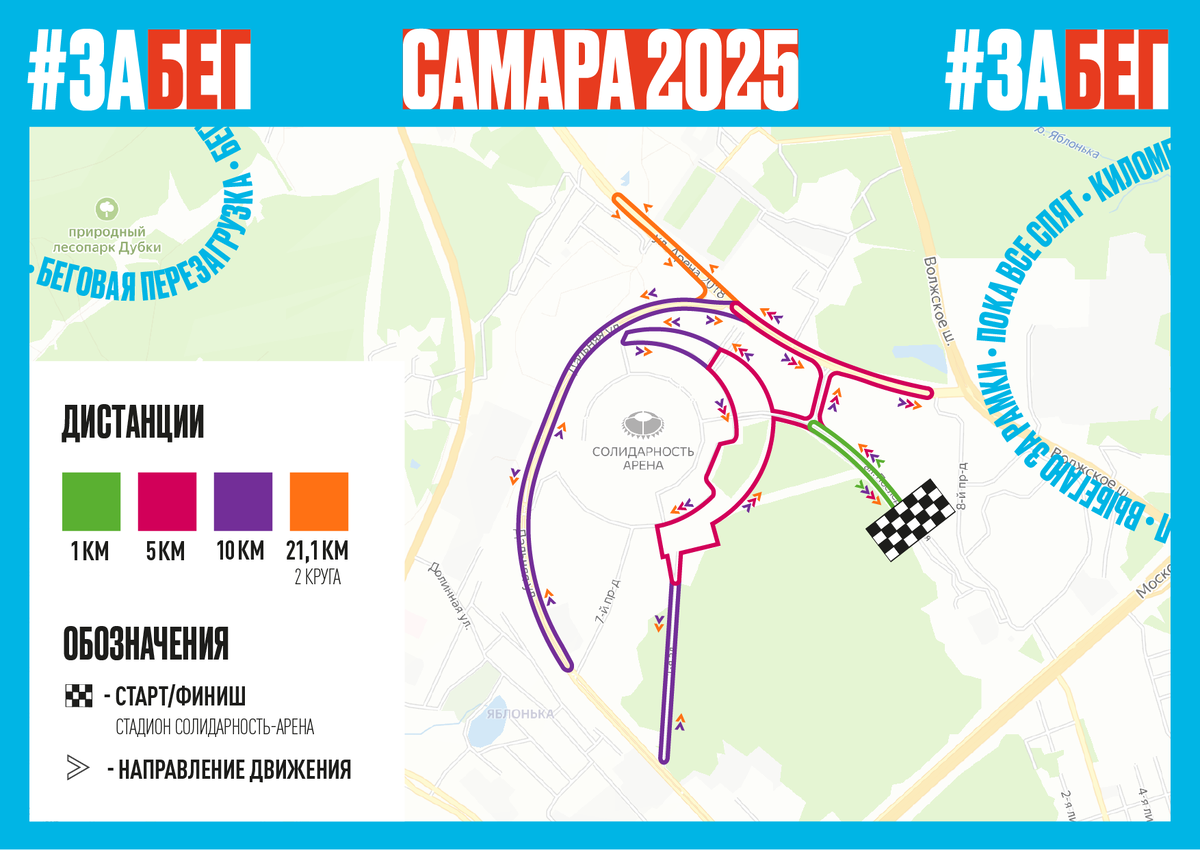 1 км — старт в 09:00 Маршрут ведёт среди раскидистых деревьев и аккуратных дорожек парковой зоны. Здесь каждый участник сможет насладиться атмосферой праздника, а начинающие бегуны, семьи с детьми и юные спортсмены почувствуют себя в своей стихии. Это короткое, но живописное путешествие подарит вам возможность сделать первые шаги к вашим целям, ощутить поддержку зрителей и зарядиться энергией на весь день. ПСБ 5 км — старт в 11:00 На дистанции в 5 км участники обегают "Солидарность Арену", пробегая по её внешнему кольцу. Затем маршрут уходит на живописную петлю по проспекту Арена 2018. Здесь открываются захватывающие виды на стадион, а зелёные зоны вокруг создают атмосферу уюта и спокойствия. Просторные участки позволят вам сосредоточиться на своём темпе, а также насладиться бегом в компании единомышленников. Это идеальная возможность испытать себя и укрепить уверенность в своих силах! 10 км — старт в 10:00 Маршрут уходит, на улицу Дальняя, включая длинный прямой участок вдоль парка. З