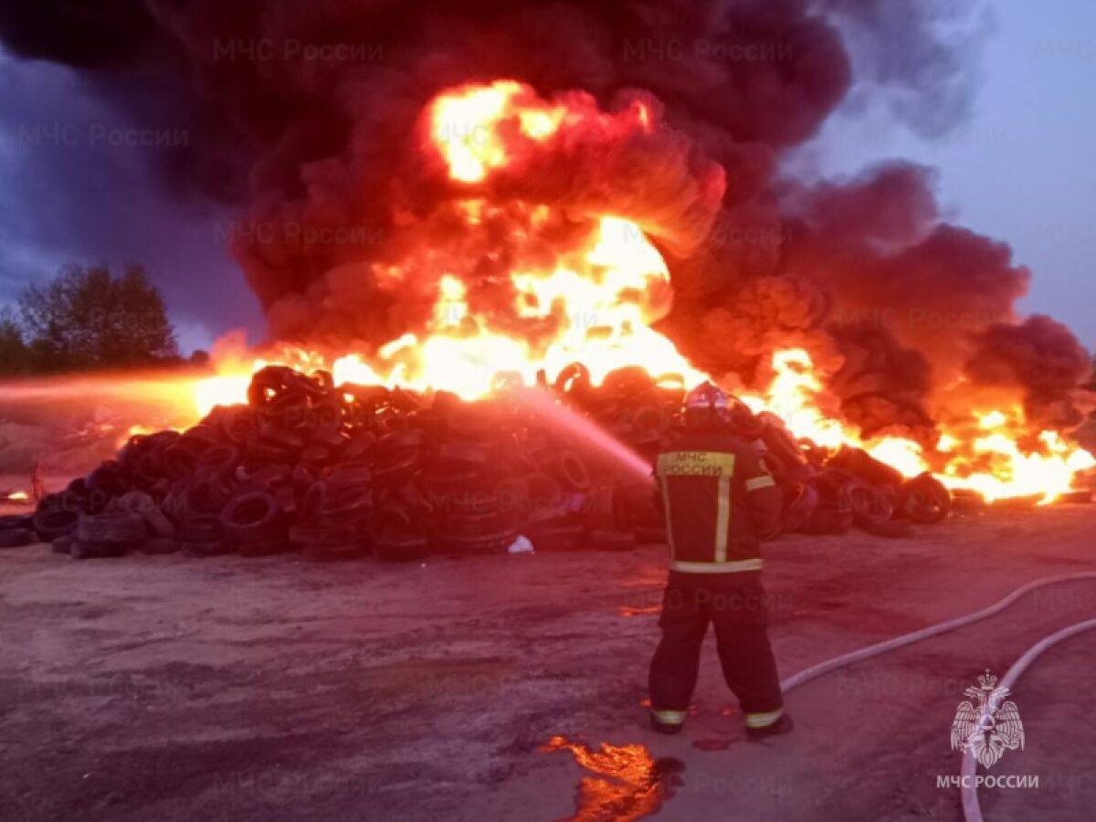 📍Место пожара - г. Мценск, ул. Болховская. Загорелась свалка с автомобильными покрышками