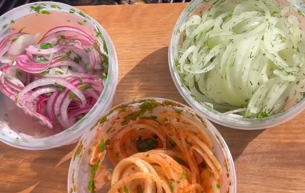 К шашлыку обязательно нужен лук — он подчеркивает вкус мяса, добавляет свежести и текстуры. Предлагаю три быстрых варианта маринованного лука — все они готовятся за 5 минут и настаиваются всего полчаса. У каждого — свой характер: один пряный, другой кисленький, третий с ароматом зелени. Выбирай под настроение или под тип мяса! Вкус: пикантный, слегка дымный, отлично подходит к свинине или колбаскам. Ингредиенты: Приготовление: