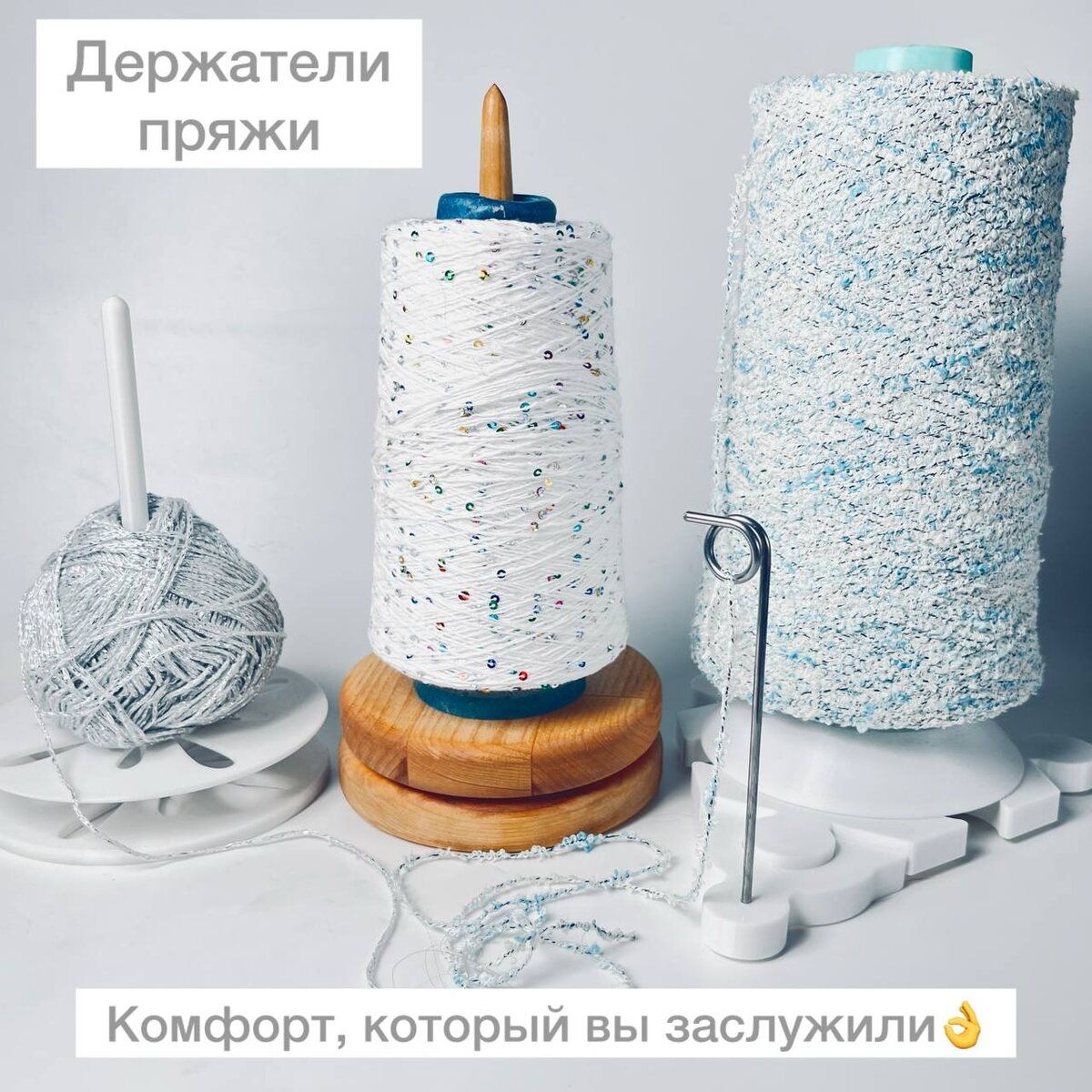 Если вы хоть раз ловили моток под диваном или распутывали нить, обвившуюся вокруг всего, что только можно, — вам точно стоит познакомиться с держателями для пряжи. Держатель для пряжи — это простое, но гениальное приспособление, которое помогает нитке подаваться ровно, не скатываться, не путаться и не собирать на себя всё вокруг. В этой статье расскажу, какие держатели бывают, на что обратить внимание при выборе и что советую из личного опыта. 🔸 Какие бывают держатели пряжи? ✅ 1. Вертикальные Моток или бобинка надевается на стержень и свободно вращается по мере разматывания.
