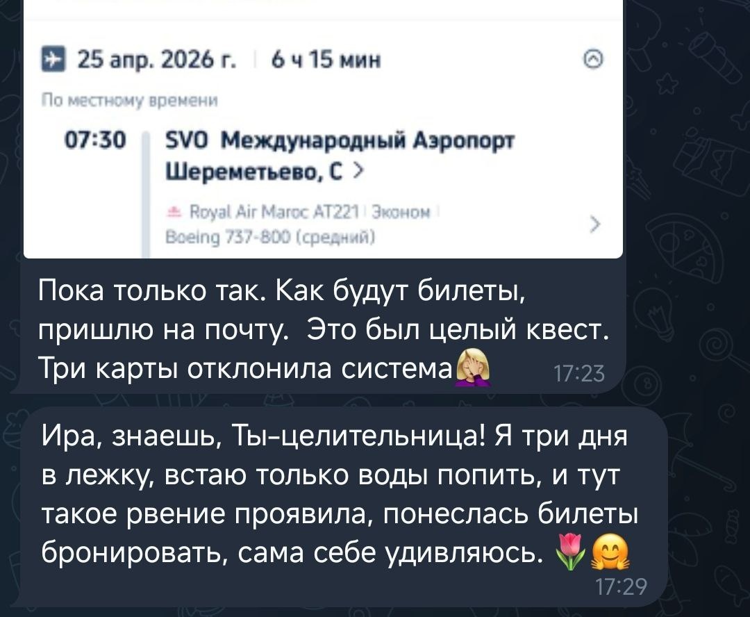 Кого-то исцеляю, кого-то порчу, но все вместе они летят в Марокко в мае 2026 года. Долгосрочное планирование такое долгосрочное, что я сама в шоке. Но прямые билеты по 33.000 туда-обратно решают!