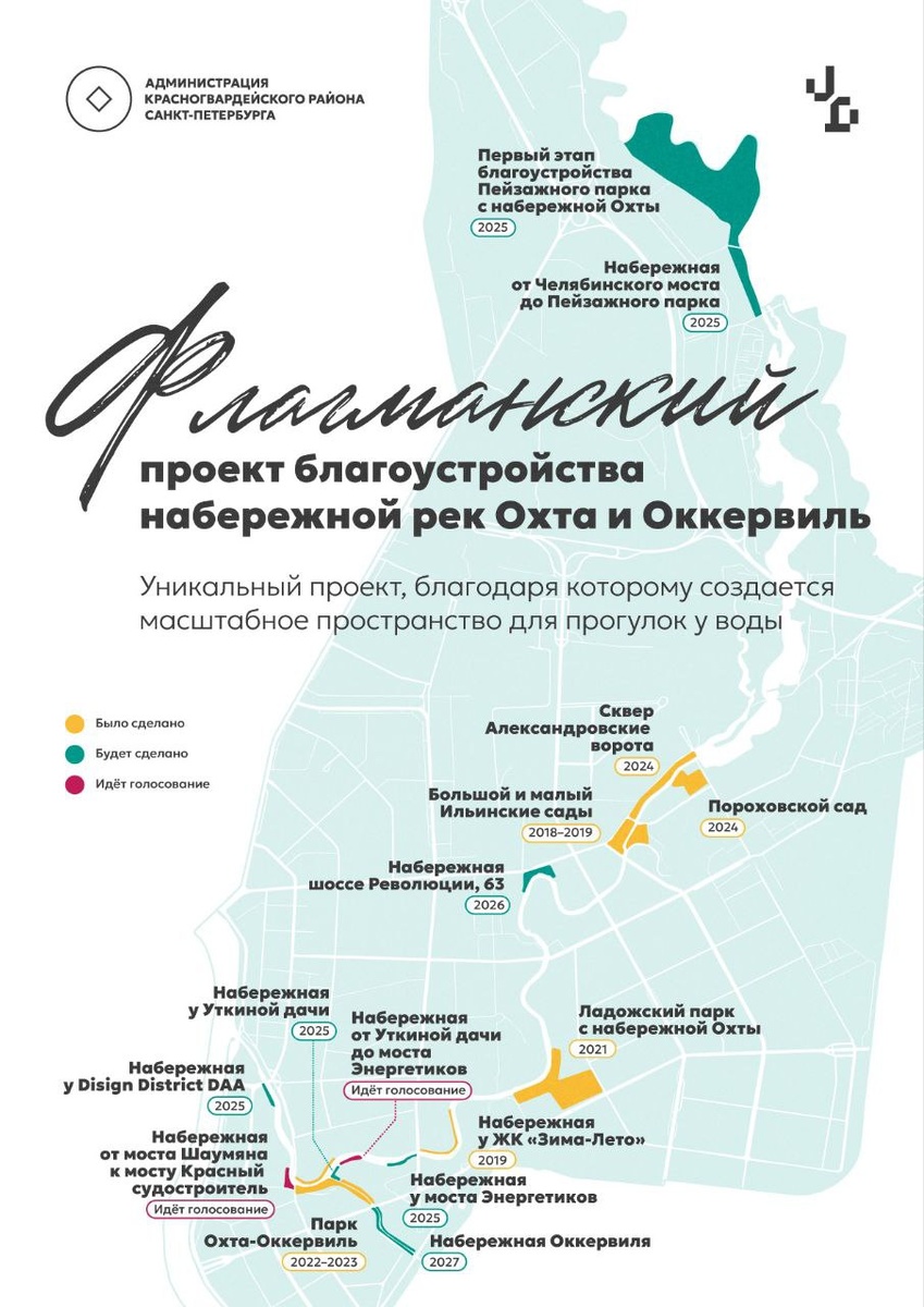 🏞 Охта и Оккервиль меняются — решайте, что дальше Каждое новое пространство на берегах Охты и Оккервиля — результат поддержки жителей. За последние годы в районе появились десятки новых садов, парков и набережных, появились маршруты для прогулок, отдыха и спорта. С 2018 года в районе реализуется масштабный флагманский проект по благоустройству Охты и Оккервиля. Уже создано 7 общественных пространств, а до 2030 года в планах полностью благоустроить береговую линию главной водной артерии Красногвардейского района. В этом году идёт голосование за два участка на берегу Охты. Поддержите флагманский проект прямо сейчас. Как проголосовать: 1. Перейдите на сайт 2. Авторизуйтесь через Госуслуги 3. Выберите регион — Санкт-Петербург 4. Укажите Красногвардейский район и поддержите проект, который нужно реализовать в первую очередь.