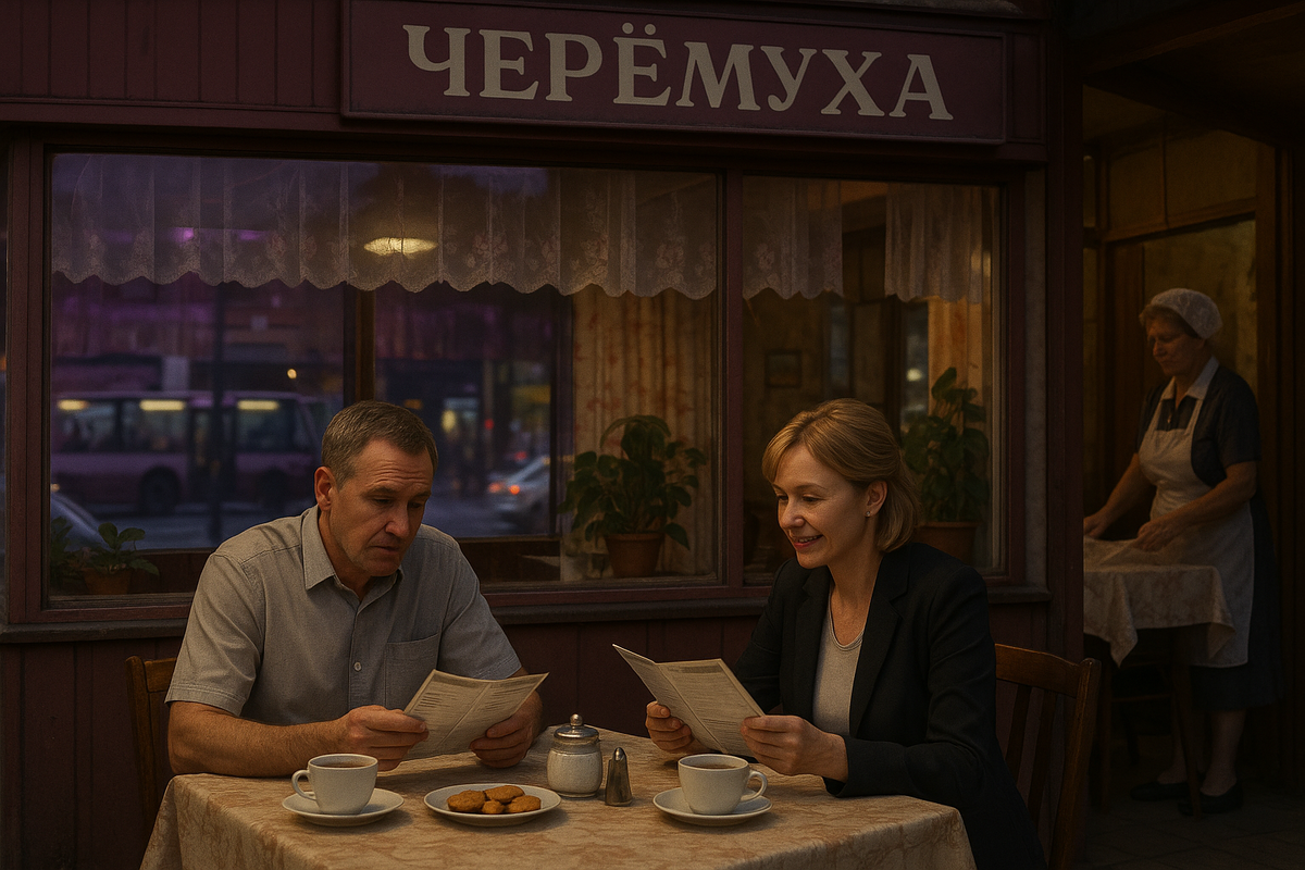 Кафе “Черёмуха” стоит у остановки уже лет двадцать, и, кажется, не меняется вовсе — те же стёкла в расцветку свекольного компота, те же перчатые официантки, что суетливо поправляют скатерти. Здесь я, Стас, оказался не в первый раз — ещё в молодости приводил Наташу (она потом стала моей женой). Тогда меню казалось густым, как жизнь впереди, и в кошельке почему-то всегда хватало.