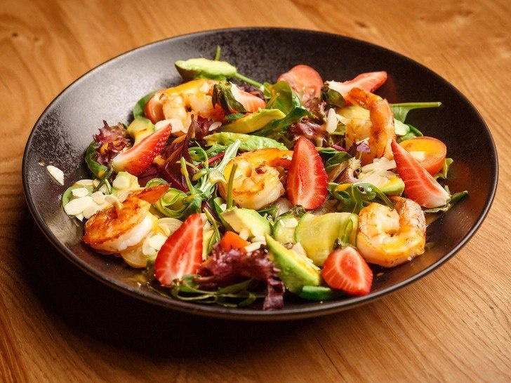 Быстрый и очень вкусный салат. Даже я бы сказала, что невероятно вкусный. Ведь со мною согласятся, что там где креветки, это и для праздничного стола и для пикника. Рецепт на 2 персоны Ингредиенты лук красный (1/2 шт) креветки очищенные замороженные (300 гр) клубника свежая (7 шт) зелень свежая по вкусу (75 гр) сыр фета (по вкусу) огурец свежый средний (1 шт) Для заправки масло оливковое (3 ст.л.) уксус бальзамический (2 ст.л) вода (2 ст.л.) соль морская (1/2 ч.л.) перец чёрный молотый (1/4 ч.л.) Смешайте все ингредиенты для салатной заправки в отдельной ёмкости. Пожарьте очищенные креветки на сковороде с толстым дном на небольшом количестве растительного масла. Сковороду предварительно разогрейте и жарьте креветки до золотистой корочки на сильном огне. Пока креветки готовятся, нарежте клубнику, сыр фета, огурец кубиками, лук полукольцами. Зелень сохраните в исходном виде. Когда креветки приготовятся, смешайте с остальными ингредиентами, полейте салатной заправко