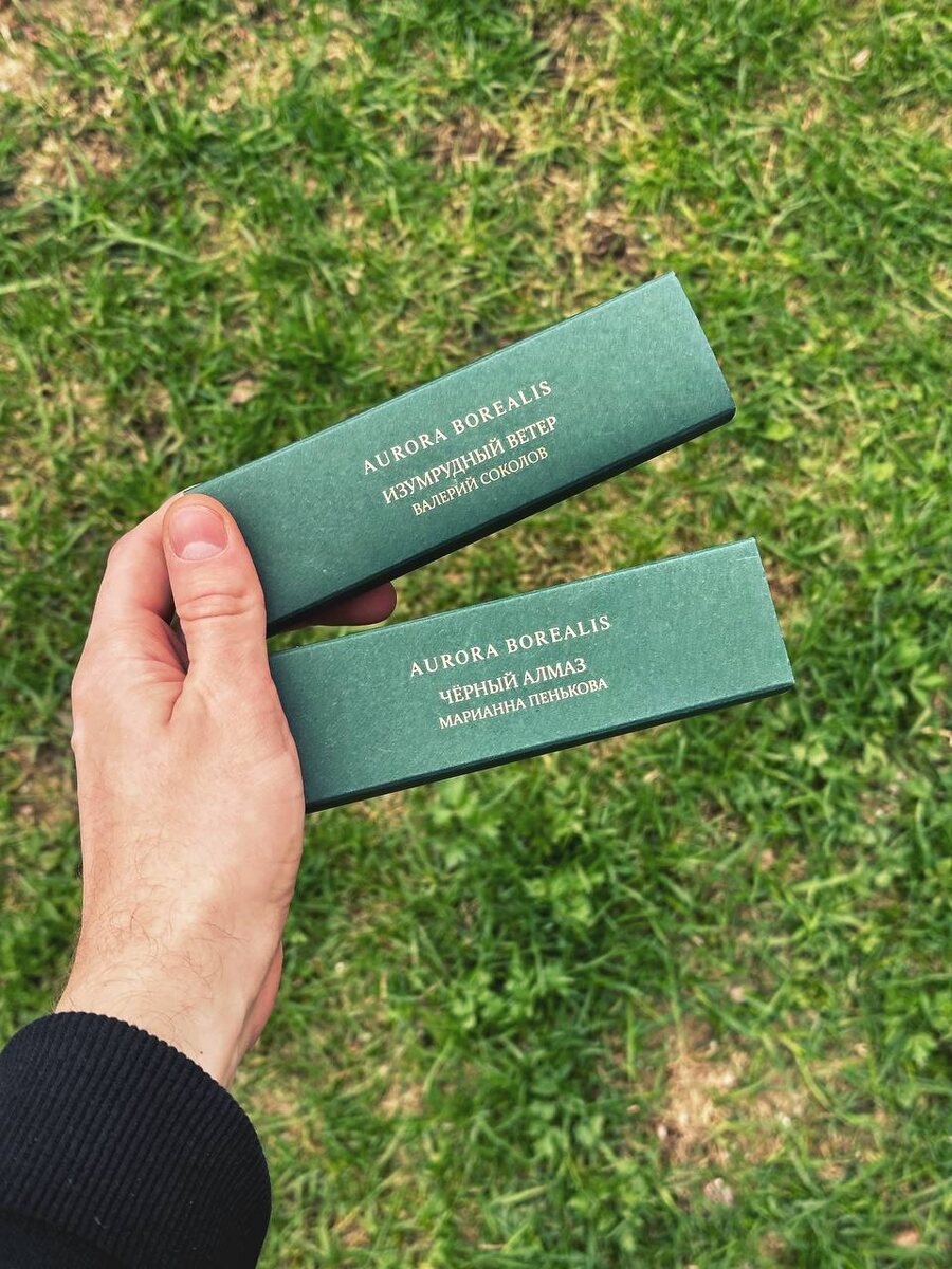 У меня в руках новинки от Aurora Borealis — те, которых ещё нет в продаже. Но как только они появятся, я вас уверяю, вы их захотите. «Изумрудный ветер» авторства Валерия Соколова ассоциируется с мерцающим джин-тоником. Хрустальный стакан, в котором отражаются танцы светлячков. Прекрасная работа, обыгрывающая хвойно-минеральное звучание можжевельника. «Чёрный алмаз», созданный Марианной Пеньковой, пахнет тёмной бархатной кожей с пряно-бальзамическим тоном бессмертника. Ещё нравится оттенок фиников с горечью шоколада. Ждём больших флаконов.