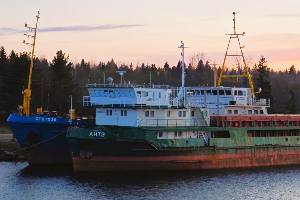 Порт ⚓️ Вознесенье⚓️ Продолжим нашу закатную рубрику. Теплоходы: ⛴️ АНТЭ, тип СТ-1300, бывший овощевоз; ⛴️ СТК-1036, контейнеровоз; Оба пока не в работе. Интересно выйдут в эту навигацию?! За шикарные 📸 спасибо Рустему👍 #РечнойФлотВолгоград #Теплоход #ТеплоходАНТЭ #ТеплоходСТК