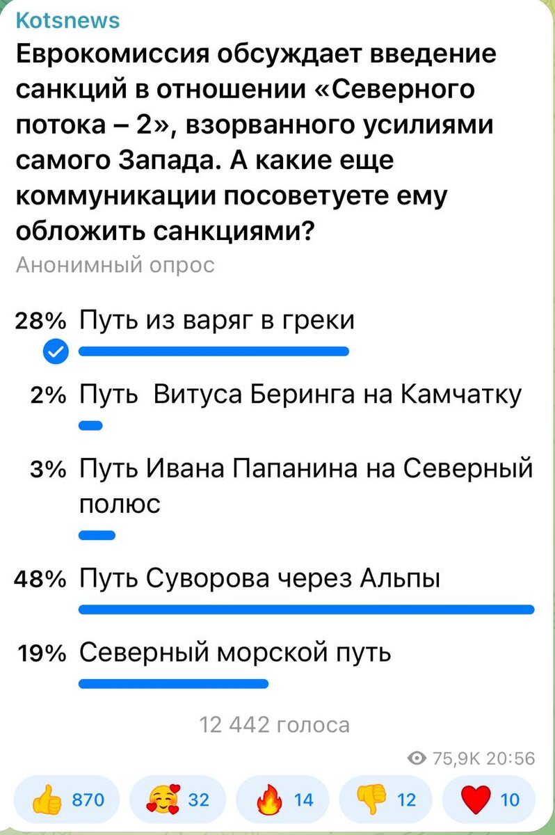 ⚡️⚡️⚡️ 48 процентов проголосовавших считают, что Западу осталось только обложить санкциями знаменитый альпийский поход Суворова